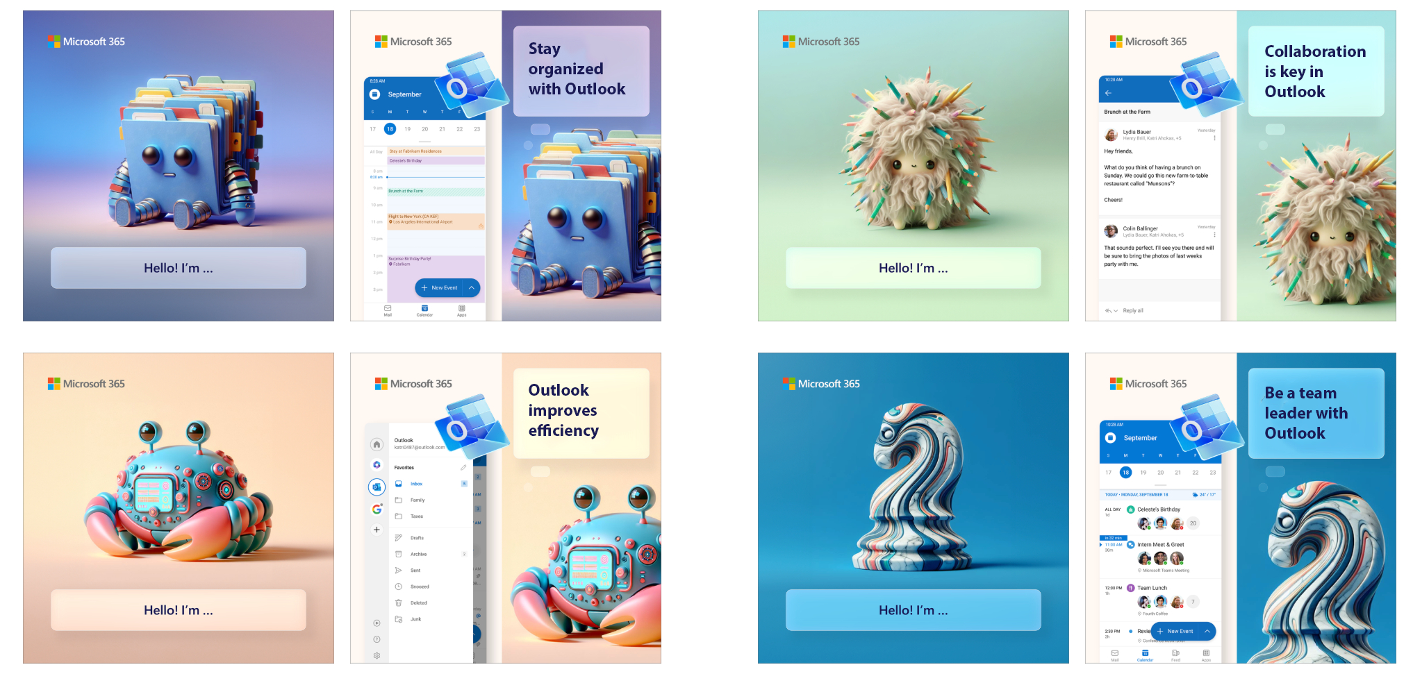 My exploration of 3D within Microsoft 365 focused on creating more intuitive user interfaces. One including a unique approach to showcasing Microsoft Copilot's image generation. I designed endearing 3D critters representing Microsoft's core values (Organization, Collaboration, Efficiency, Leadership) to visually communicate app features.